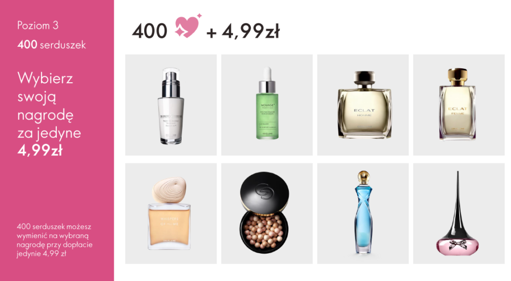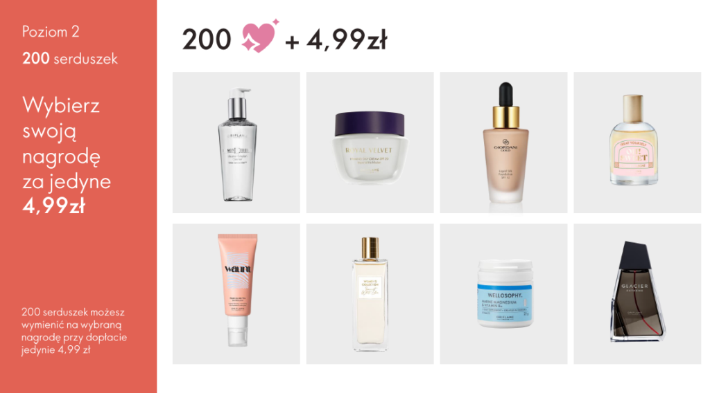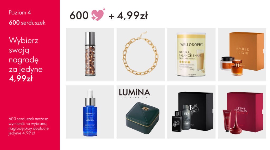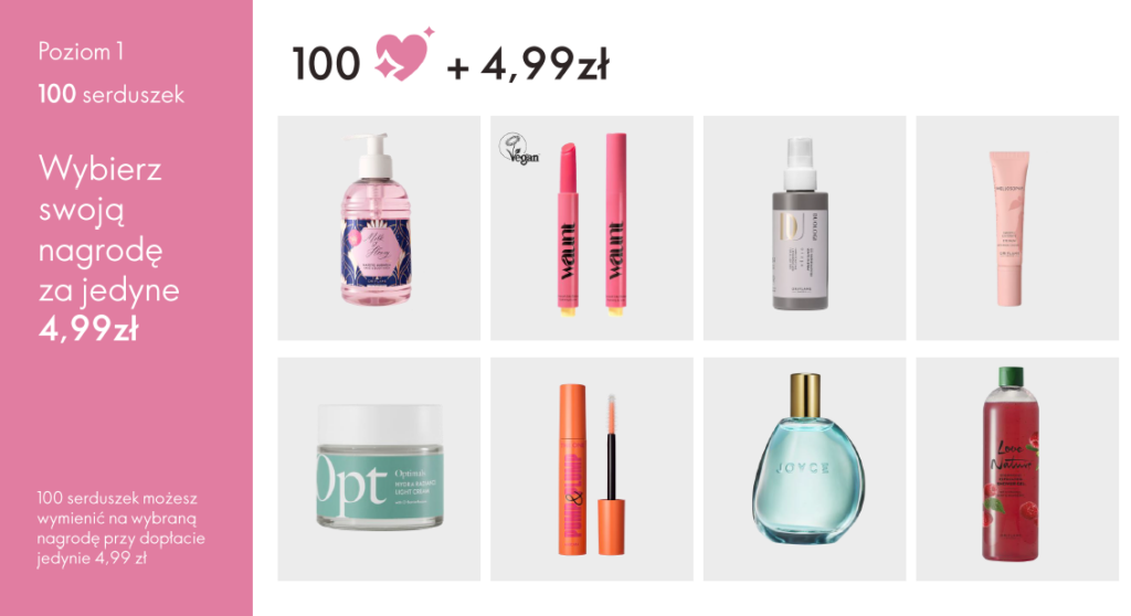 Zbierasz serduszka (są ważne przez 6 katalogów) i wymieniasz je na atrakcyjne nagrody.